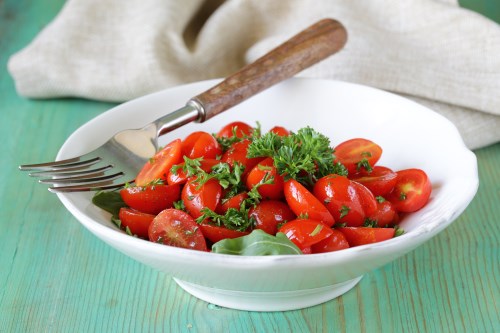 Mix tomatoes, melted extra virgin coconut oil, rice vinegar, and garlic powder together in a bowl. Crumble oregano between fingers to release flavor and add to the tomatoes; stir to coat. Season with salt. Let flavors marinate before serving, 5 minutes or up to an hour.
