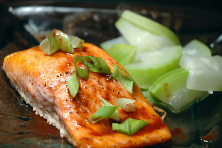 Brush salmon with plum sauce and sprinkle half of green onions on filets and let sit for 10 minutes Broil salmon 10-20 mins; check after 10 minutes Serve with additional sauce drizzled over filets and sprinkle with remaining green onions.