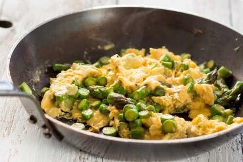 Add the eggs; sprinkle with the cream cheese. As the egg sets, use a large spatula to softly scramble eggs. When eggs are still a little runny, add the asparagus and the parmesan. Keep on scrambling eggs until set to your taste.