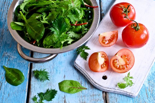 In a salad bowl, combine the escarole, romaine, bibb lettuce and tomatoes.
