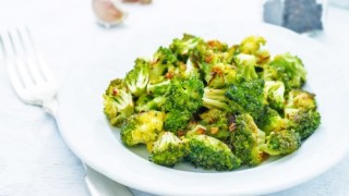 Toss broccoli and garlic together in a large bowl. Drizzle extra virgin coconut oil over the broccoli; toss to coat. Spread broccoli and garlic onto a baking sheet; season with onion powder, salt, and black pepper.
