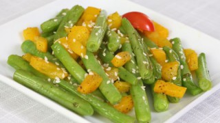 Meanwhile, in a small bowl, stir together the soy sauce, miso paste, red pepper flakes, garlic and ginger. Pour over the green beans and toss to coat. Sprinkle sesame seeds on top.