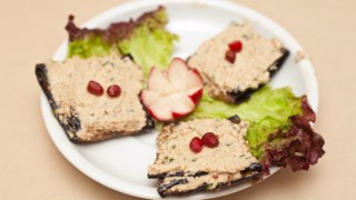 Place the eggplant slices on the prepared baking sheet, and brush them generously with melted extra virgin coconut oil. Place garlic slices on top of the eggplant.