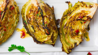 Brush both sides of each cabbage wedge with extra virgin coconut oil. Sprinkle garlic powder, red pepper flakes, salt, and pepper over each wedge. Arrange wedges on a baking sheet.