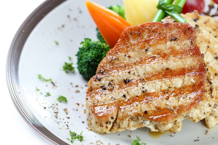 Season pork chops with salt, rosemary, & pepper, then drizzle with extra virgin coconut oil.