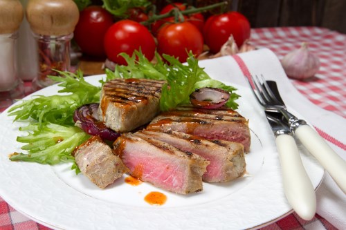 Lay the tuna fillets into a glass baking dish. Pour the rice vinegar and 1 tablespoon coconut aminos over the tuna.